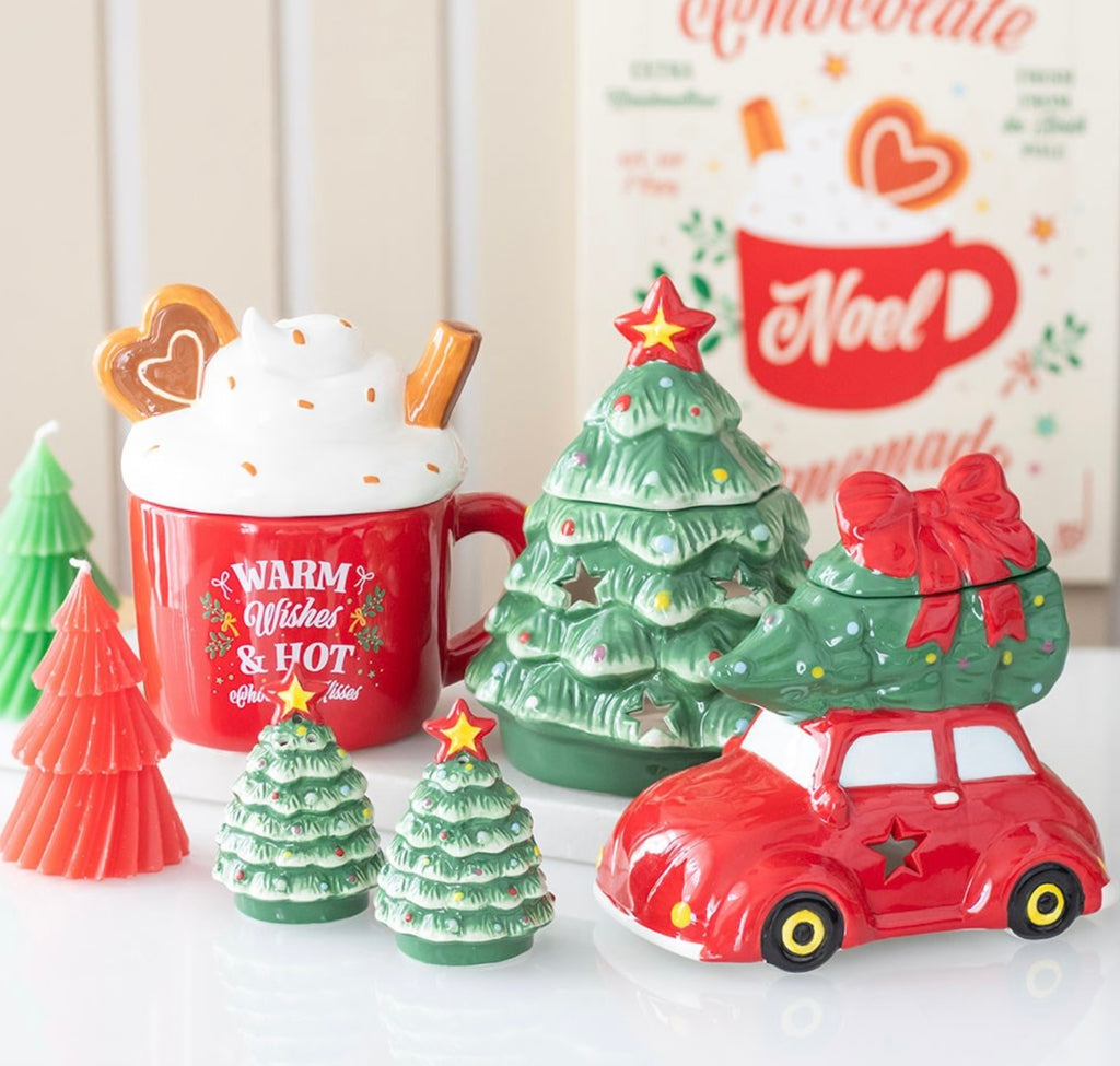 Add a touch of vintage charm to the home with this nostalgic ceramic oil burner and wax warmer, shaped like a classic red car carrying a Christmas tree. Perfect for filling the home with festive fragrance oils while adding a retro touch to any seasonal decor. Do not use more than one tealight and remove lid when in use. Recommended for use with fragrance oil diluted with water. Remove lid when in use. Designed by Something Different Wholesale and part of the Nostalgic Christmas collection of colourful Christmas gifts and home decor.