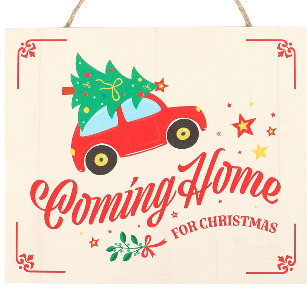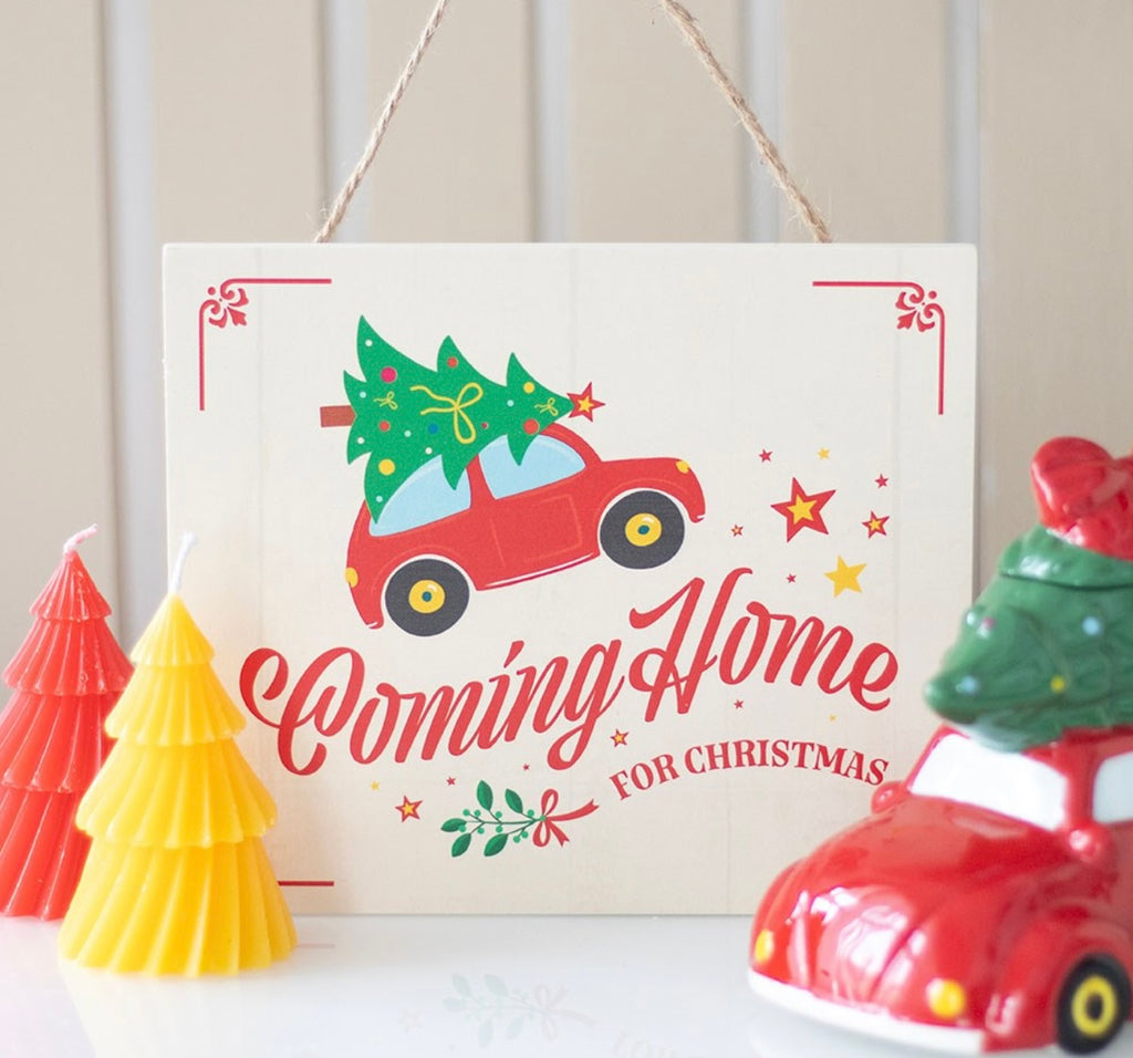 Spread some Christmas cheer with this festive hanging sign, featuring a vintage red car carrying a Christmas tree design and 'Coming Home for Christmas' text. Whether hung on a door or displayed on a mantelpiece, this sign adds a cosy touch to any space. Designed by Something Different Wholesale and part of the Nostalgic Christmas collection of colourful Christmas gifts and home decor.