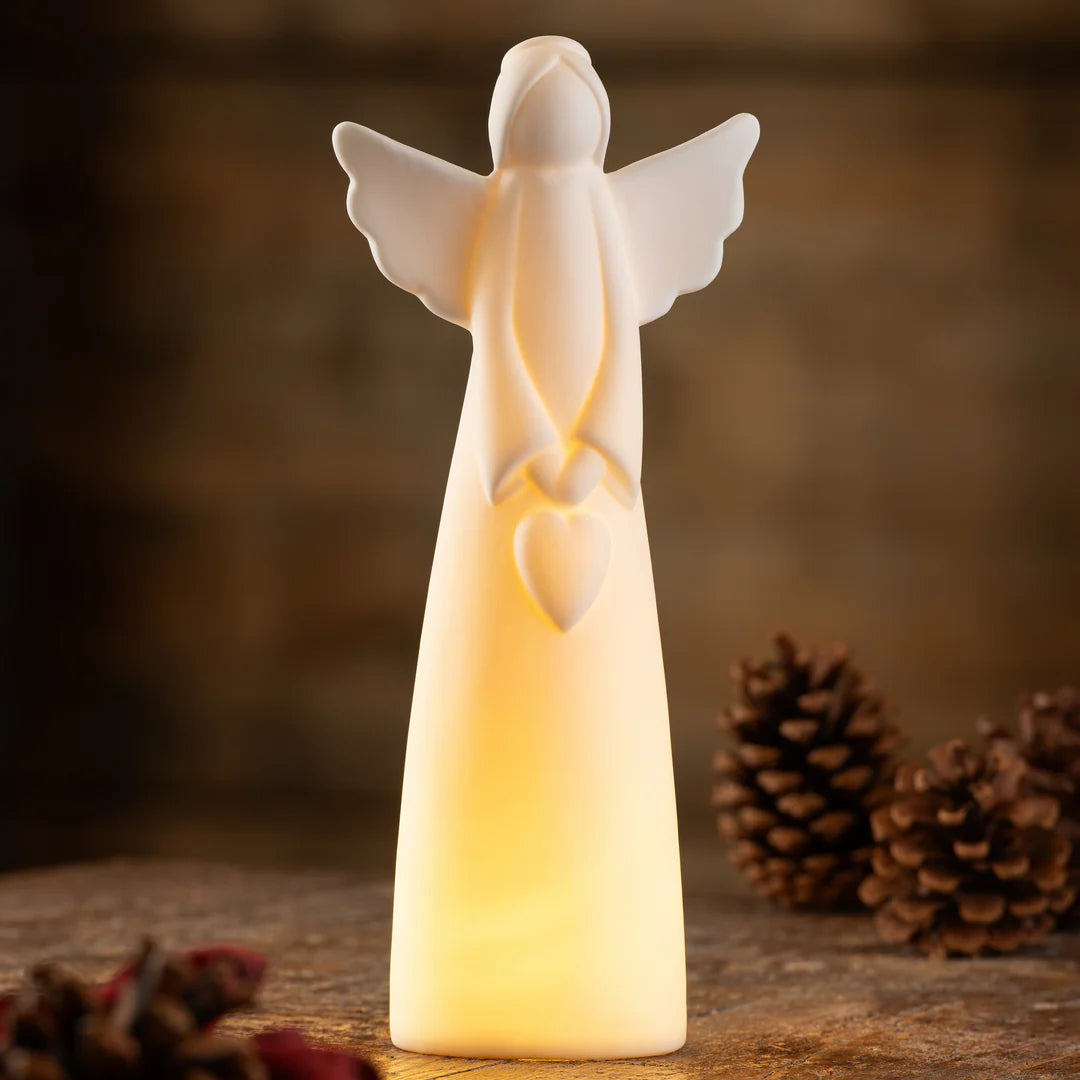 This minimal style angel has been crafted from porcelain. Featuring a cute heart detail, this angel is elegant and understated at the same time. The battery-operated LED illuminates the porcelain highlighting all the soft details.
