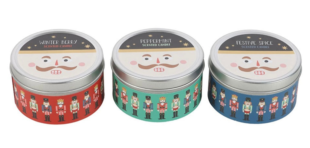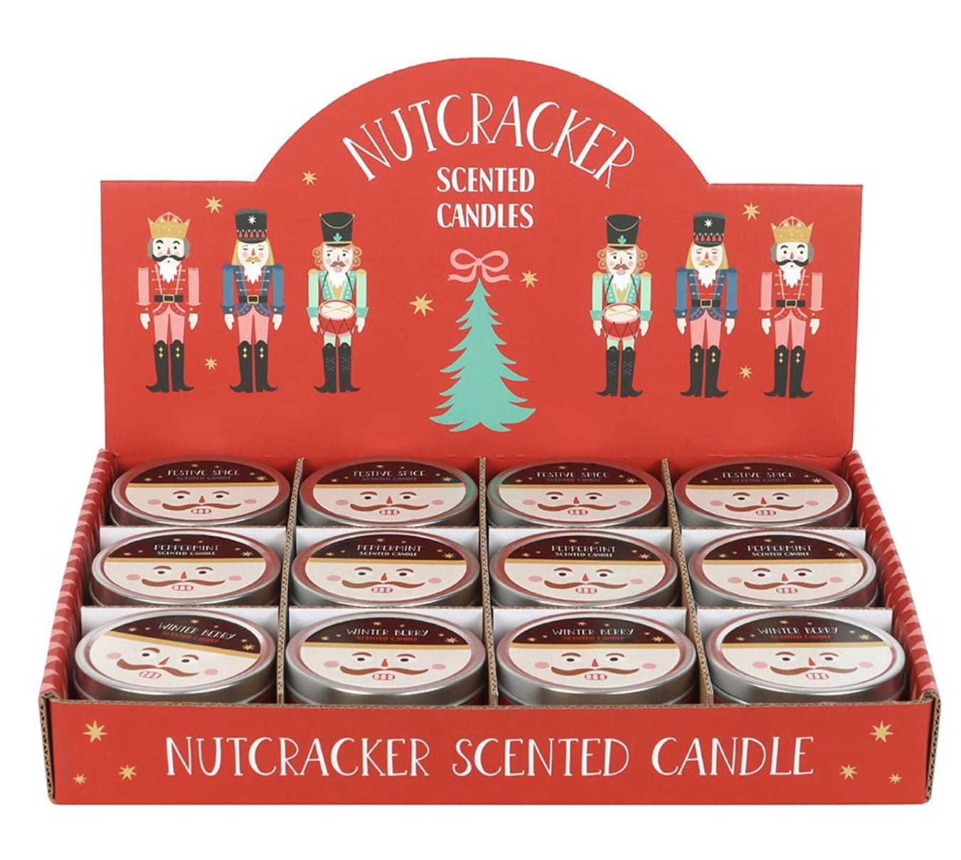 Fill the air with festive cheer with this set of 12 scented candle tins, beautifully displayed in a matching cardboard display. This set include 3 different fragrances; Winter Berry, Peppermint, and Festive Spice, featuring traditional nutcracker designs on the packaging. A delightful gift for stocking fillers to bring classic festive fragrance into the home. Sold in multiples of 12, with 4 of each fragrance. Approx 25 hour burn time per candle. Designed by Something Different Wholesale and part of The Nutcracker collection of Christmas gifts and home decor.