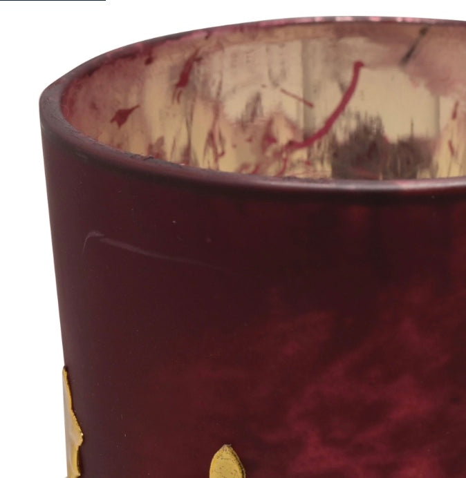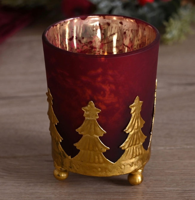 A Christmas tree glass tea light holder by THE SEASONAL GIFT CO®. This festive tea light holder will glisten throughout the Christmas period. The glass holder showcases gorgeous red colouring, complete with a gold metal Christmas tree design and matching feet on the base. It provides ample room for a tea light or small candle of choice. The holder is packaged in a brown box with sticker.