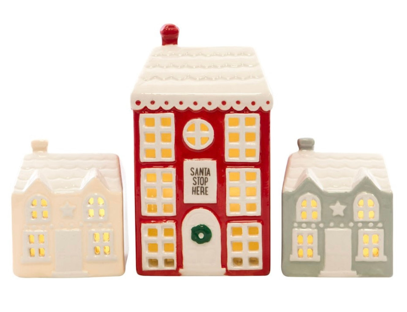 Turn on the charm this Christmas with this trio of ceramic houses that light up from within. Display together to create a sweet village scene or place throughout the home for some festive cheer. Sold as a set of 3 houses. LED lights with bottom on/off switch. Designed by Something Different Wholesale and part of the Christmas Village range of festive gifts and home decor.