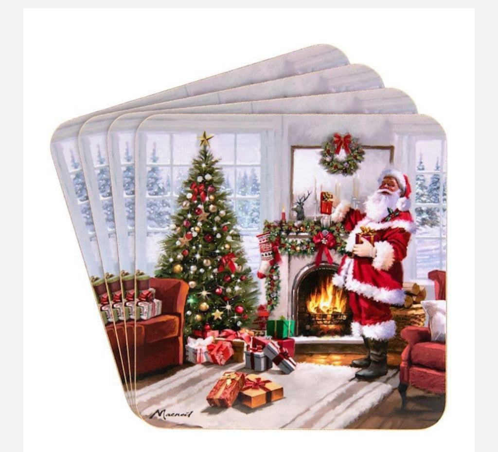 Set of 4 Festive Santa Coasters is backordered and will ship as soon as it is back in stock.