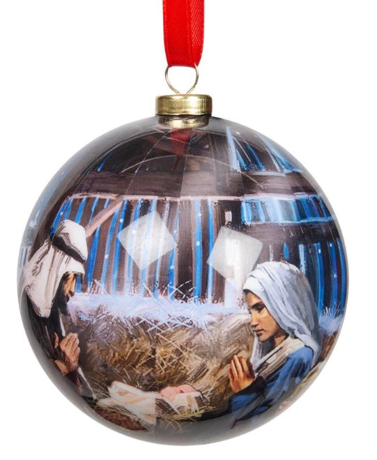 A set of 7 gift boxed Nativity scene baubles with artwork from Richard Macneil. From the North Pole Novelties Co. - the one stop shop for Christmas cheer! Details: - 7cm diameter bauble - Richard Macneil illustrated Nativity scene designs - Red hanging ribbons - Luxury lidded storage box - Shatterproof plastic baubles