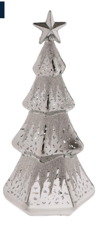 A silver Christmas tree LED light by THE SEASONAL GIFT CO®. This shining silver tree provides gorgeous decoration for Winter Wonderlands at home. The glass tree features a silver finish, complete with white, snow effect detailing. Its LED light allow the tree to glow during Winter evenings over the festive period. The light is packaged in a brown box.