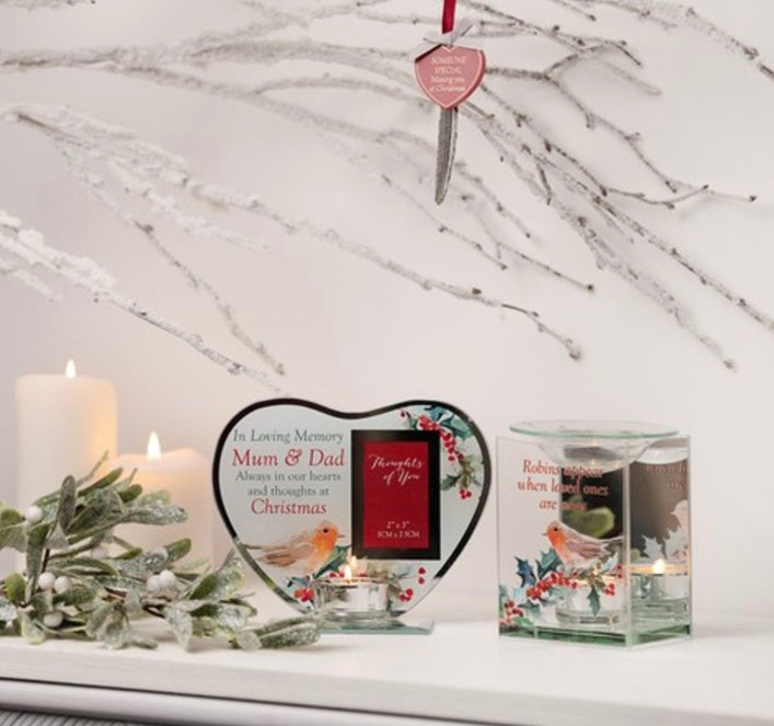 A ‘Mum & Dad’ Christmas photo tea light holder from Thoughts of You by CELEBRATIONS®. This poignant ornament provides an eternal flame for those who mattered the most. The beautifully decorated ornament features a rectangular glass base, upon which sits a silver glass tea light holder. Attached to the base is a glass heart, complete with small portrait aperture, printed ‘Robin and holly’ design and ‘In Loving Memory Mum & Dad’ sentiment. The tea light holder is packaged in a plain packing box.