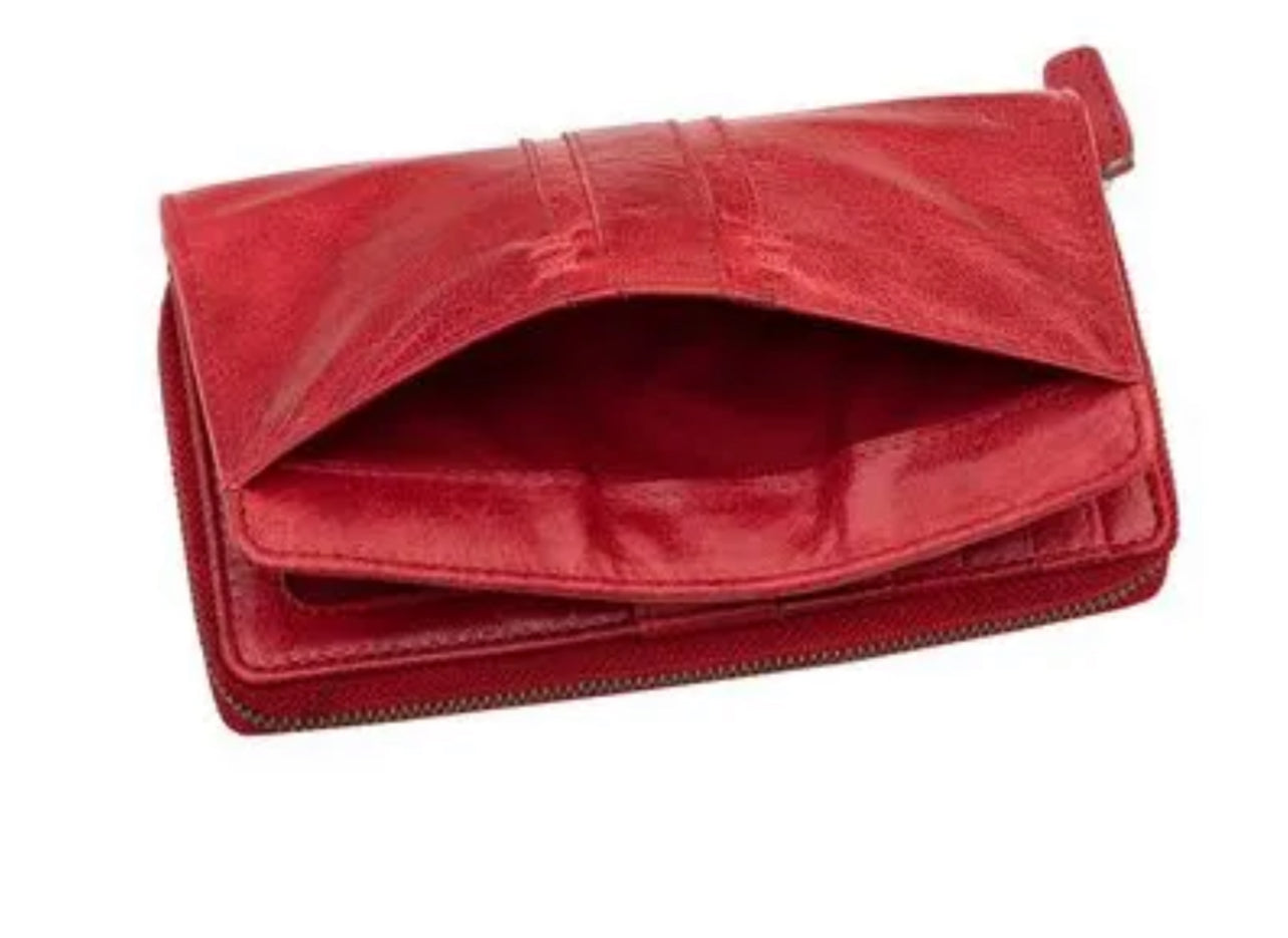 Arizona Large Leather Purse in Red. This purse will do everything you need it to do. Expertly handcrafted out of the Arizona waxy leather its engineered to last. The design is simple to use, held together by a popper, just open it up and you have 5 card slots, ID window and large note compartment. On the rear you have a large zipped coin pocket for all your loose change and bits. We have fitted RFID shielding technology to prevent unwanted access to electronic data and the large size will make the purse easy to find in any bag. Popper opening Slip pocket on the front 5 Credit card slots ID window Slip pockets Rear zipped change pocket with 2 compartments Large note pocket Size: 16 x 9.5 x 3 cm Weight: 148g