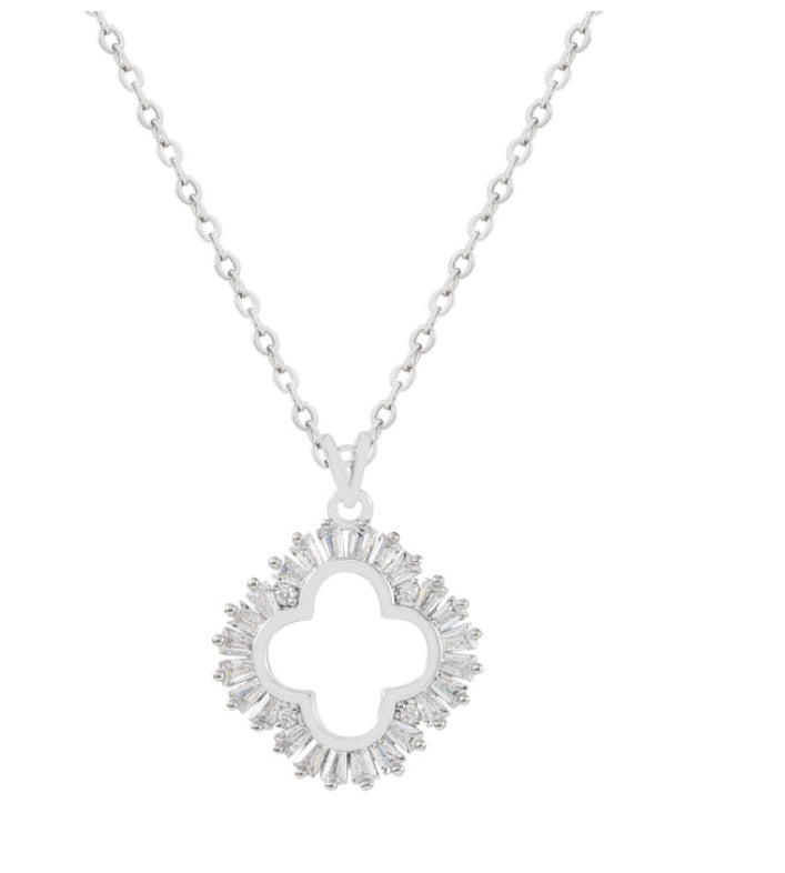 This radiant silver pendant features a delicate cutout flower design, encircled by a halo of sparkling CZ stones that catch the light beautifully. Suspended from a fine adjustable chain, it brings refined glamour and versatile elegance to any look.