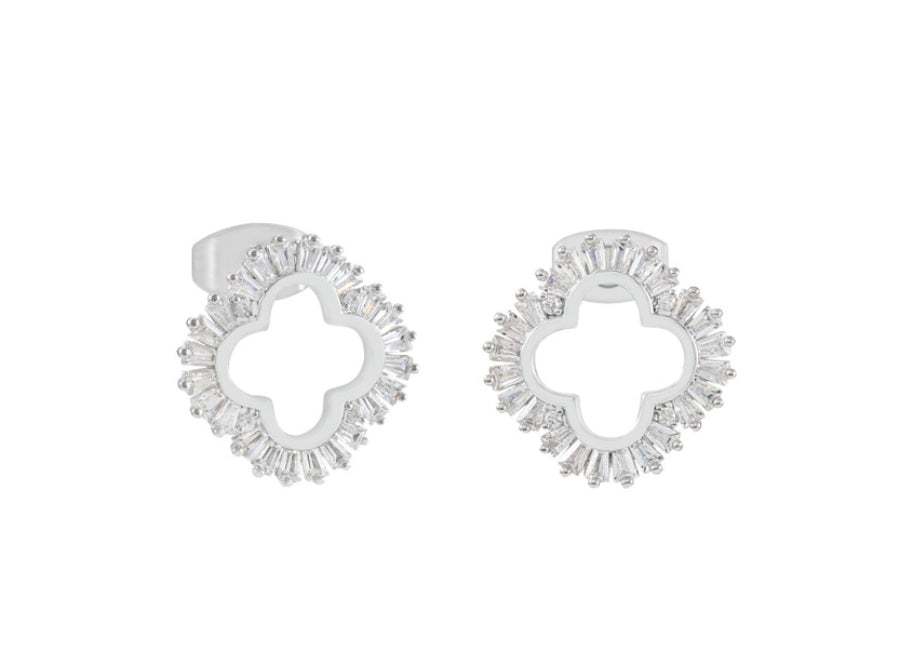 These striking silver earrings feature a delicate cutout flower motif framed by a halo of baguette-cut cubic zirconia. The open design creates a light, modern look, while the surrounding sparkle adds a touch of glamour reminiscent of vintage Hollywood. Crafted in polished silver with secure post backs, they are versatile enough to elevate both daywear and evening looks.