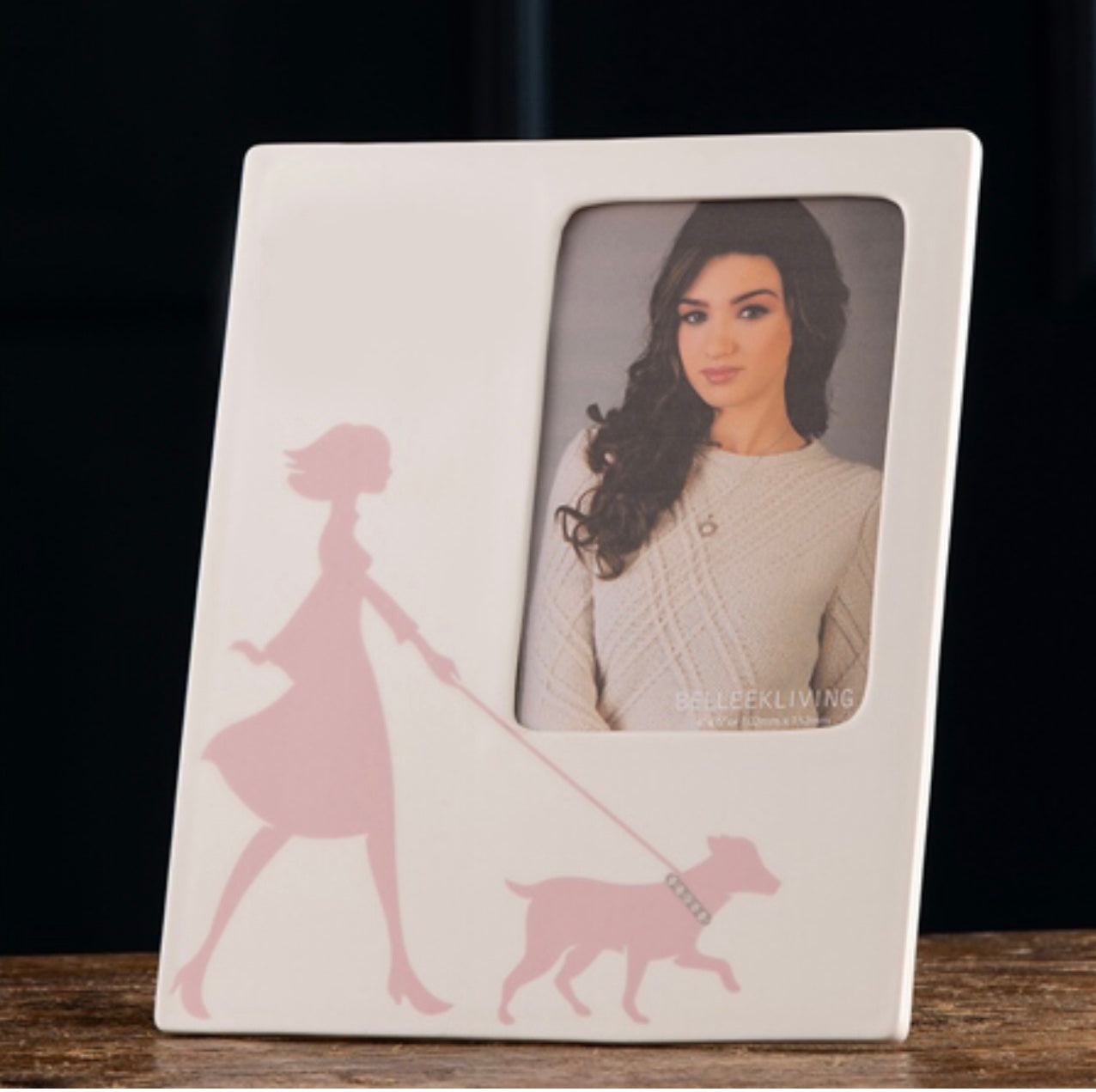 The Walkies 4 x 6 Frame is a largely ivory frame with a pink lady walking a dog along the front. Suitable for those dog lovers, or a dog themed room, this frame is perfect to frame those wonderful moments with your four legged friend. Suitable for a portrait photo only.