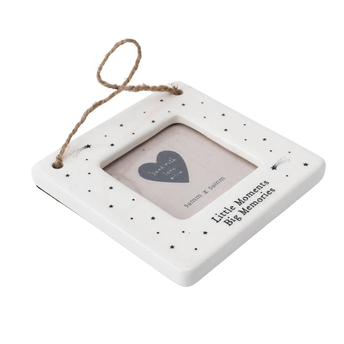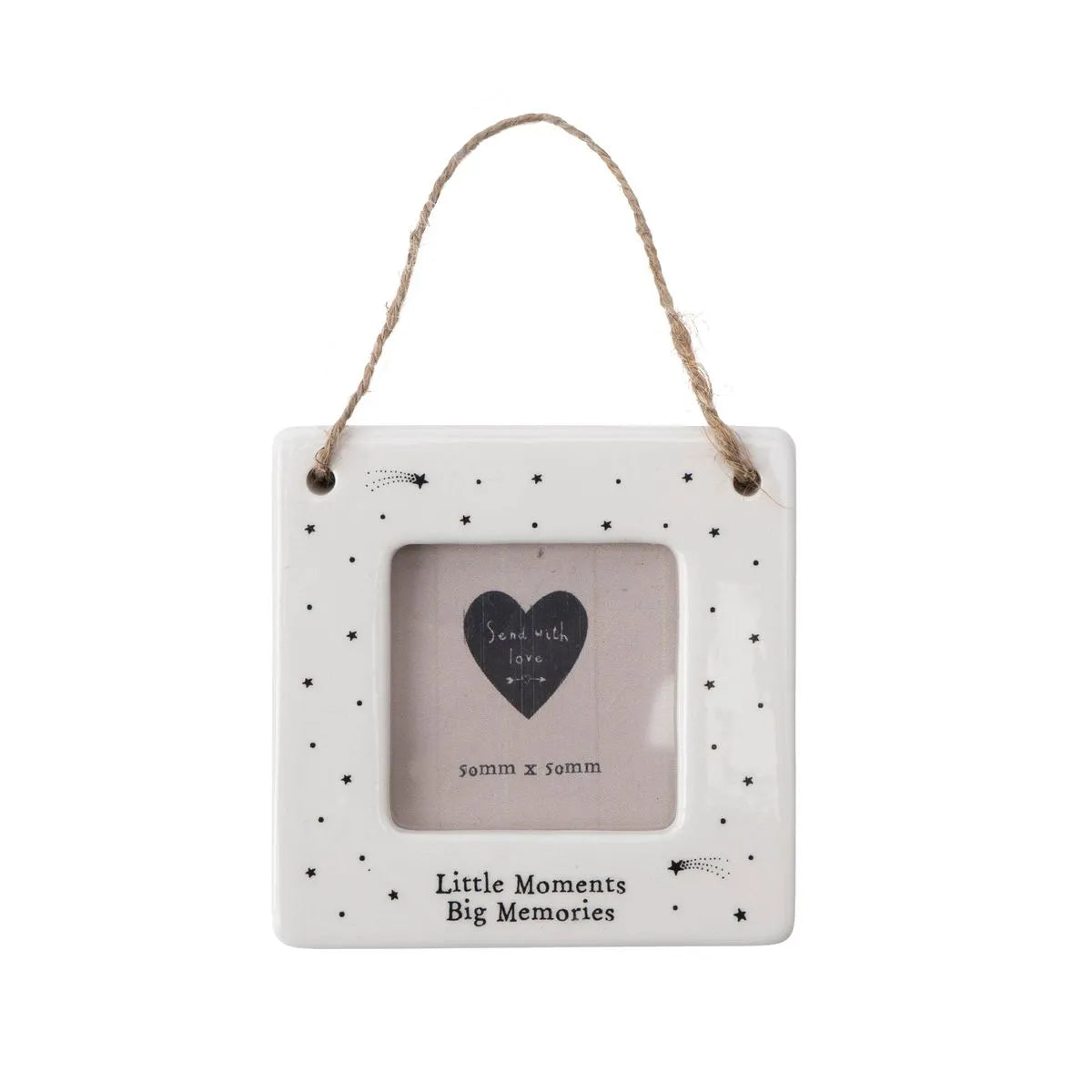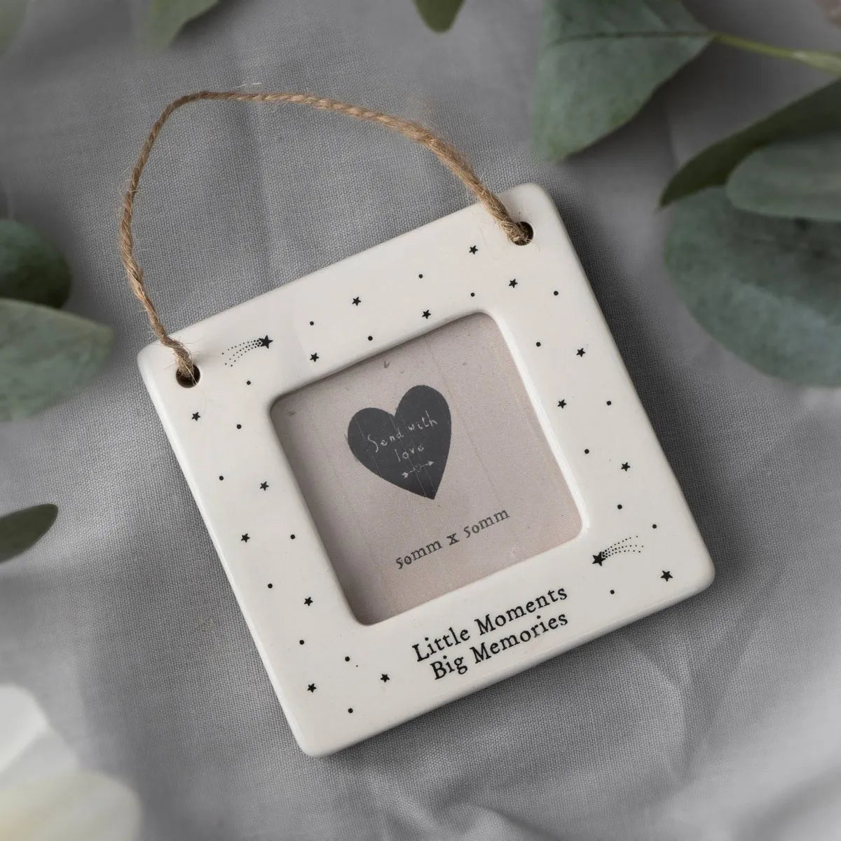 A Beautiful Design | A lovely mini ceramic hanging photo frame in cream with hand painted stars design. Jute ribbon for hanging. Slogan reads | 'Little Moments, Big Memories'Comes Gift Boxed | Making it a perfect gift for that special occasion, wedding, Christmas, special Birthday, Anniversary, New Home or just to remember a special memory. Dimensions | Height: 8cm x Width: 8cm x Depth: 1cm | 85gDesigned in Cornwall